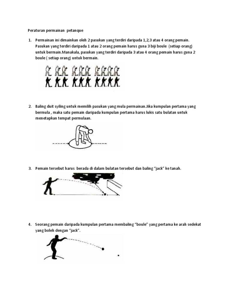 100 100 found this document useful Mark this document as useful. Petanque merupakan suatu bentuk permainan boules BOLA yang tujuannya adalah untuk melempar bola besi dengan sedekat mungkin dengan bola kayu yang di sebut. 0 0 found this document not useful Mark.